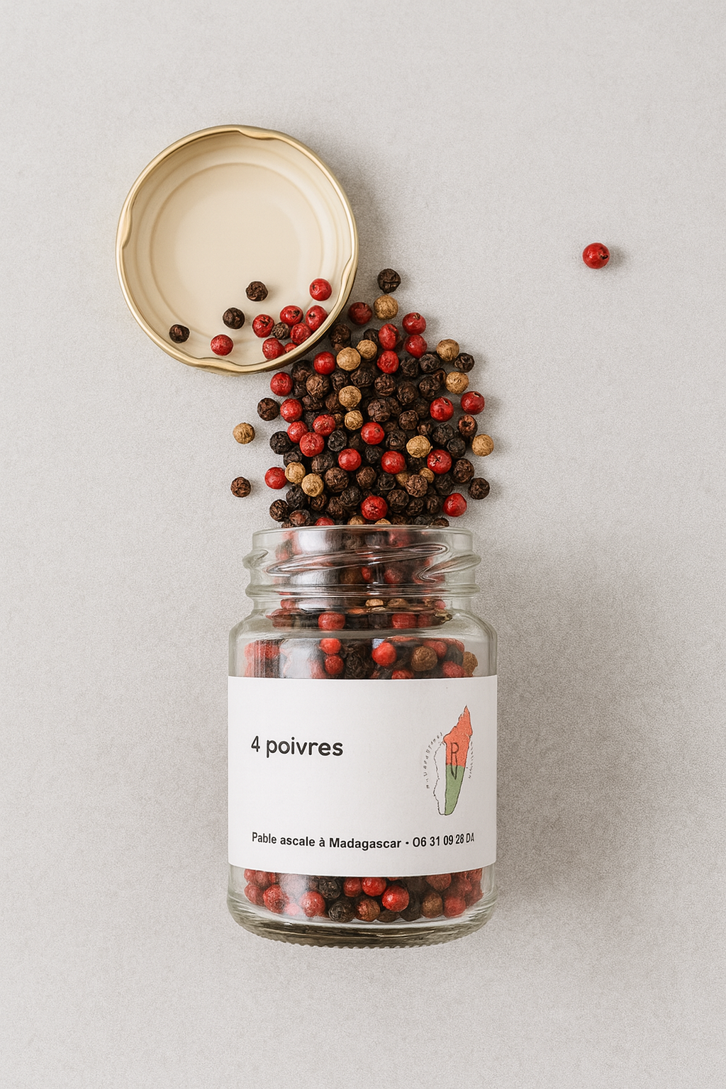Offrez une touche d’élégance à vos plats avec notre mélange 4 poivres de Madagascar, un équilibre subtil entre intensité, douceur et fraîcheur. Chaque variété de poivre est soigneusement sélectionnée puis assemblée à la main.